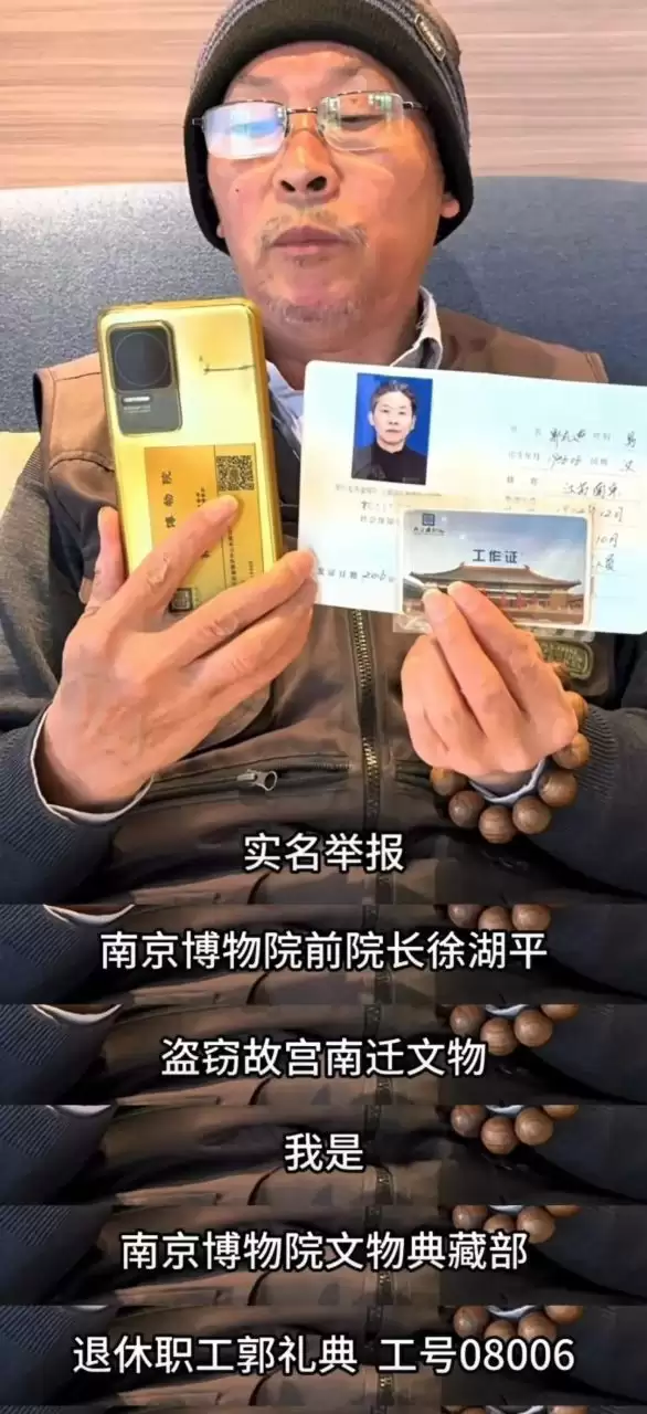 南京博物院退休员工郭礼典,2025年12月21日,在微信视频号“南博典藏人”,实名举报南京博物院原院长徐湖平大规模盗窃、走私故宫南迁国宝文物。
