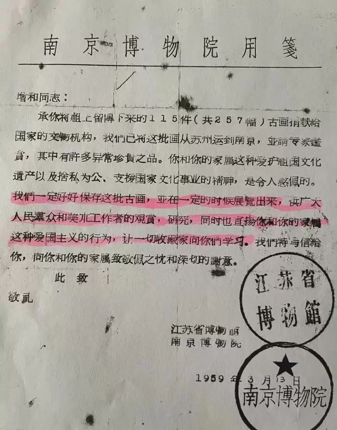 ▲南博1959年3月13日接受捐赠致谢庞家后人的信上写着:“我们一定好好保存这批古画”。