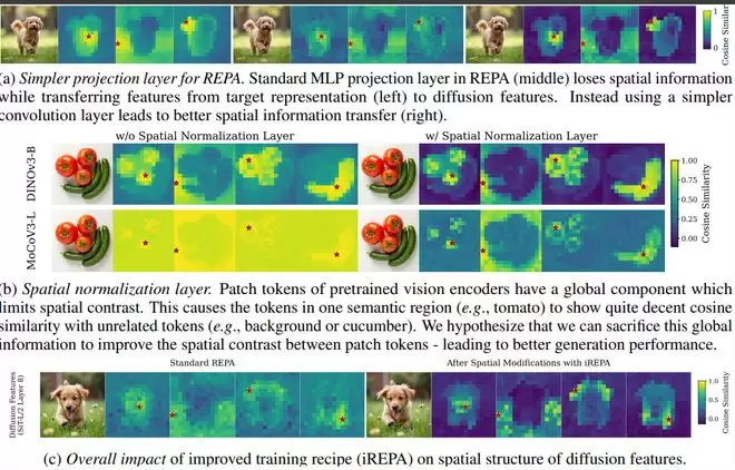 iREPA如何通过两处修改,恢复生成所需的空间结构。 (a) 使用卷积投影替代MLP,可更好地保留局部空间关系。 (b) 空间归一化层通过移除全局分量,提高patch之间的空间对比度。 (c) 经过这两步修改后,iREPA生成的diffusion特征呈现出更清晰的空间结构。