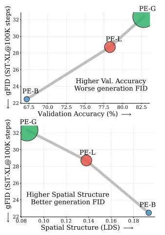 先看一个已经被反复验证的事实:一个模型在ImageNet上的线性探测准确率越高,并不意味着它更适合用来做生成。