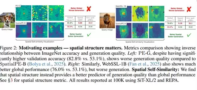 PE-G和WebSSL-1B在ImageNet上具有更高的分类准确率,但它们的空间自相似性显示,前景与背景被过度拉近,边界模糊。相比之下,空间结构更清晰的SpatialPE-B,生成质量显著更好。