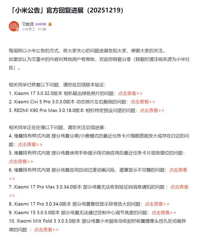而其余正在处理的问题分散在不同机型的特定场景中,比如小米17 Pro Max的验证码通知异常、小米17 Pro的壁纸显示异常。
