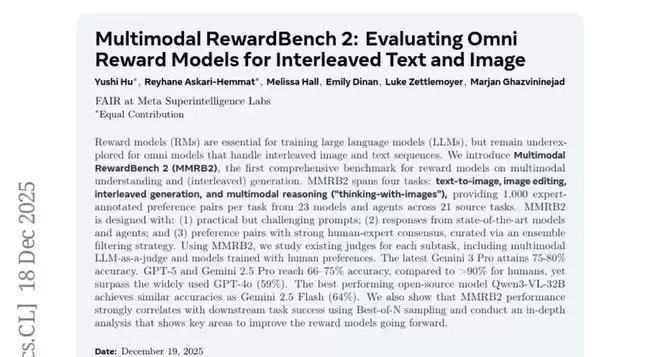 Meta AI实验室(FAIR at Meta Superintelligence Labs)的研究团队在2024年12月发表了一项突破性成果,发布了名为"Multimodal RewardBench 2: Evaluating Omni Reward Models for Interleaved Text and Image"的研究论文。这项研究由Yushi Hu、Reyhane Askari-Hemmat等研究者共同完成,论文编号为arXiv:2512.16899v1。对于想要深入了解这项技术的读者,可以通过该编号查询完整论文内容。