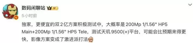 另外,还有爆料称一款设备正在积极测试更便宜的双2亿方案,大概率是200Mp 1/1.56" HP5 Main+200Mp 1/1.56" HP5 Tele,测试天玑9500(+)平台,可能会比预期来得更快。