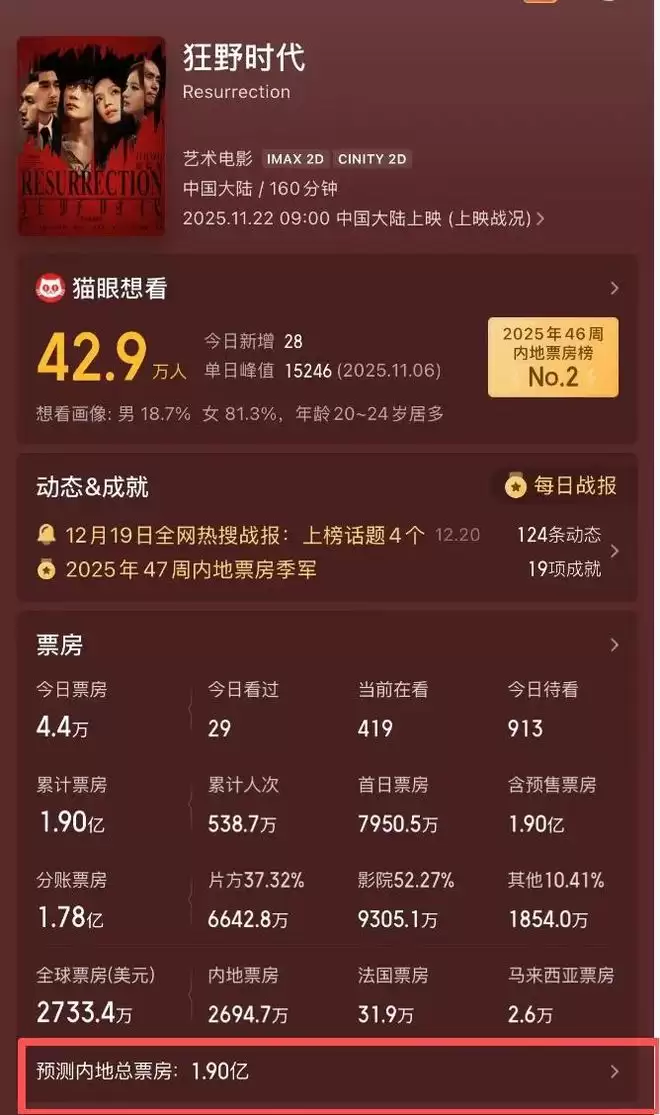 要说近期唯一票房过亿的国产片,还得追溯到一个月前上映的《狂野时代》。这部电影的票房走势,堪称今年影市最尴尬的存在之一。上映前,凭借主演易烊千玺的号召力,预售票房直接冲破1亿大关,让不少人对其寄予厚望。可如今上映已满一个月,票房却始终在1.9亿左右徘徊,想要突破2亿大关都难如登天。