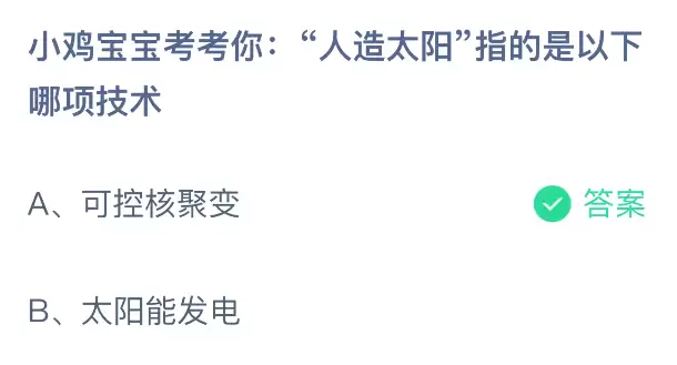 小鸡宝宝考考你:大家常说的“人造太阳”,指的是以下哪项前沿技术呢?支付宝的小鸡课堂开课啦!每天只需花上一分钟答题赚饲料,喂喂小鸡就能贡献爱心!轻松又有意义!2025年12月23日蚂蚁庄园的小鸡课堂题目正确答案是【可控核聚变】,“人造太阳”指的就是【可控核聚变】这项技术。