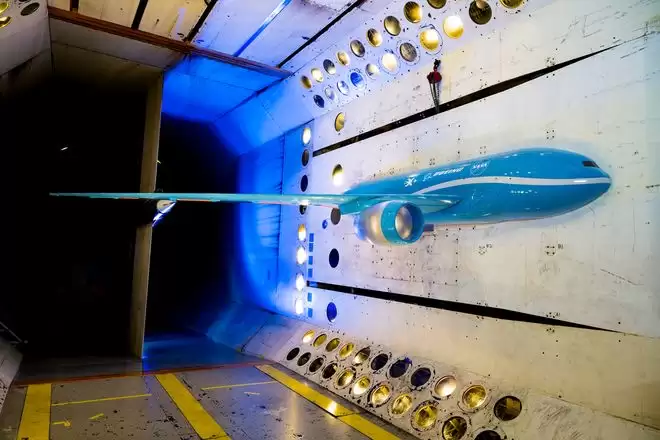 为了在获得气动优势的同时消除安全隐患,NASA携手波音公司,合作推进AWTM项目。双方在无法容纳全尺寸飞机的现实条件下,利用NASA兰利研究中心的跨音速动力学风洞(TDT),测试了一个拥有接近4米长机翼的大比例模型。