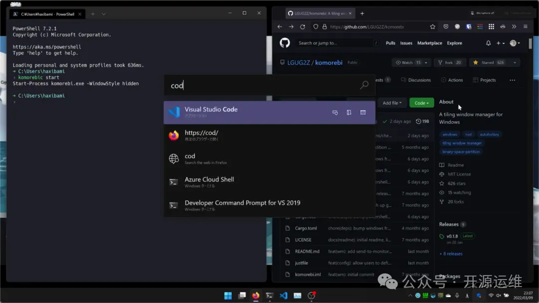 在 GitHub 闲逛时,发现一个名为 Komorebi 的 Windows 平铺窗口管理器,其星标数量相当可观。