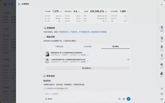 生意管家的创新,并不在于单一功能的突破,而在于构建了一套高度协同的智能经营网络。其中的「1」,即 AI 店长,扮演着全天候数字化运营负责人的角色。它如同店铺的中枢神经系统,不仅能实时诊断店铺健康状态、预警潜在经营风险,还能在双 11、双 12 等大促等关键时刻切换为商家的「贴身智能管家」。它会自动生成一份涵盖店铺整体销售、商品、订单、营销等关键场景的「经营体检报告」:包括店铺昨日销售波动、异常流失、实时的风险,同时还能给出实时风险提醒,例如「紧急补货」「有 x 商品存在营销资损风险」等关键提醒。