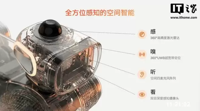 在空间智能方面,“大头 BoBo”配有 360° 激光雷达、360° UWB 超宽带定位、空间四麦克风阵列、双目深度感知摄像头,支持语音交互,端侧 AI 算力可达 128 TOPS,宣称是“迄今为止量产机器人的最高算力”。
