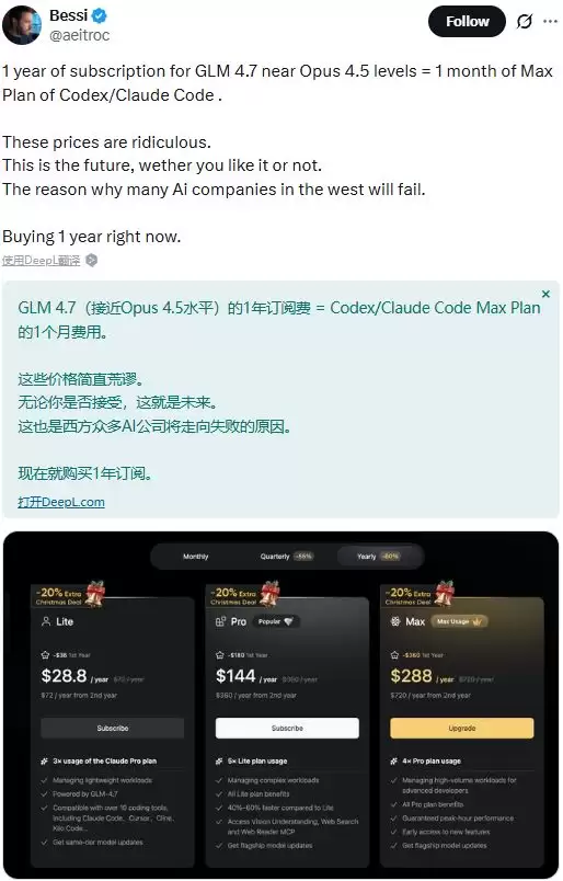价格策略也成为市场讨论的焦点。网友Bessi指出,订阅一年GLM-4.7的费用仅相当于Codex或Claude Code最高级计划一个月的价格,并认为这种极具竞争力的定价模式将对西方AI公司构成挑战,直言“无论你是否喜欢,这就是未来”。