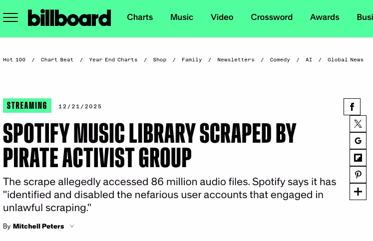 相关报道指出,该组织不仅下载了约300TB的音乐文件,还窃取了大量平台数据,其中包括25.6亿条曲目元数据以及8600万个音频文件。这些数据被批量制作成种子文件,计划通过P2P网络,也就是常见的BT种子形式进行非法分发。不过,截至12月21日周日,目前仅有元数据出现泄露情况,音乐文件本身尚未被泄露。