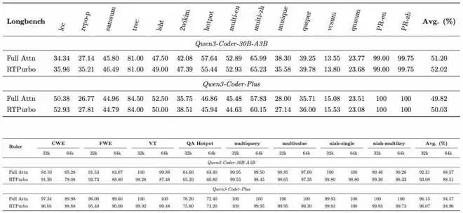 在长文本测试场景下,RTPurbo 仅保留约 15% 的 Attention Heads 使用 Full KV cache,压缩后的 Qwen-Coder-Plus、Qwen3-30B-A3B-Instruct 在多项长文指标上可与未压缩模型齐平,充分验证了压缩后模型的精度保障。