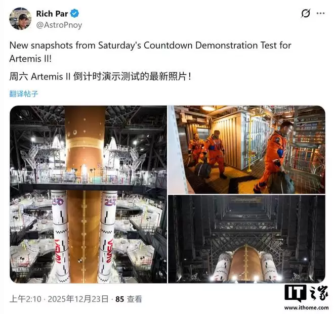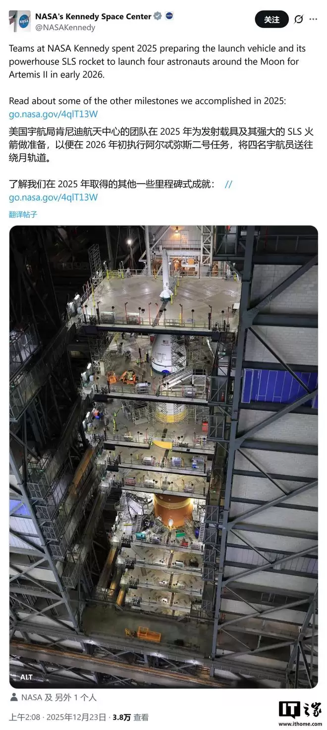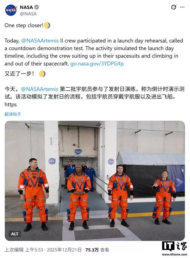 IT之家12月23日消息,科技媒体Ars Technica近日(12月20日)发布博文披露,美国国家航空航天局的四名宇航员已于当地时间2025年12月20日(周六)齐聚佛罗里达州肯尼迪航天中心,顺利完成了“阿尔忒弥斯2号”(Artemis II)载人绕月飞行任务的发射倒计时演练。