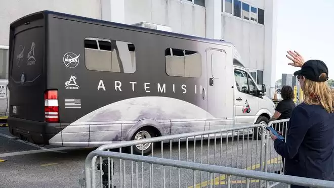 这辆长约8米(25英尺)的阿特拉斯(Atlas)旅行房车原属波音“星际客机”(Starliner)项目。美国宇航局为了适配本次任务,全面升级了其外观,车身包裹了绘有月球图案、“阿尔忒弥斯2号”任务徽章及项目标志的定制涂装,使其在视觉上高度契合重返月球的主题。