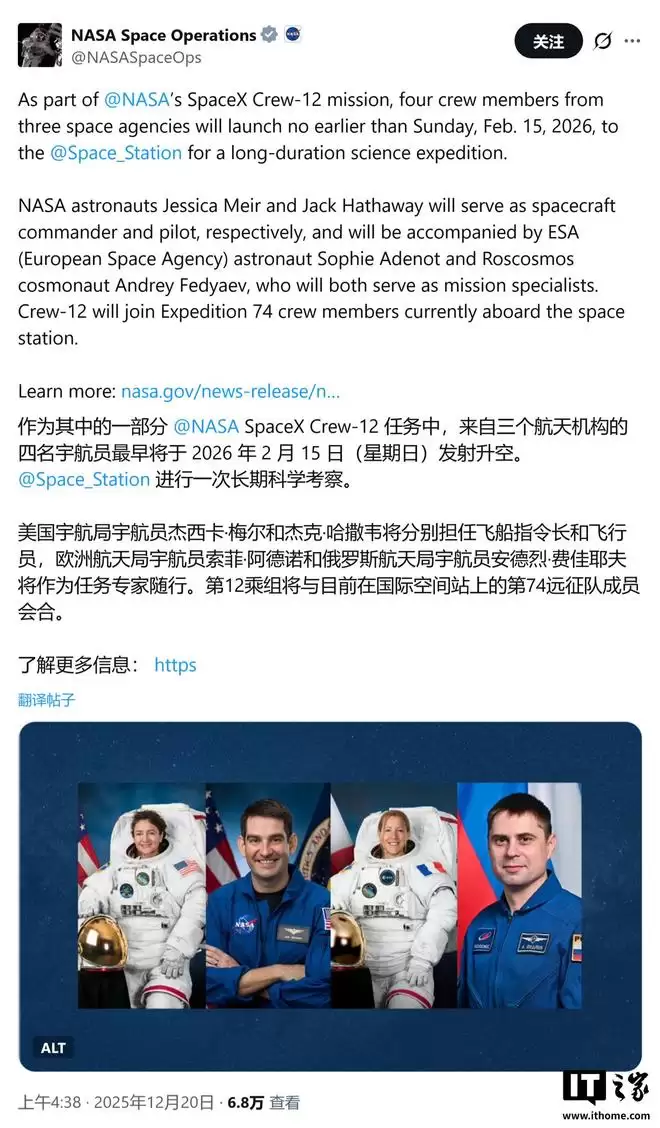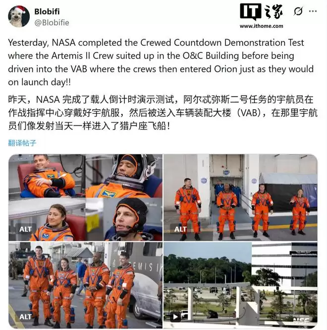 据IT之家援引该博文介绍,“阿尔忒弥斯2号”任务计划于2026年2月至4月间发射。参与本次发射倒计时演练的机组成员包括: