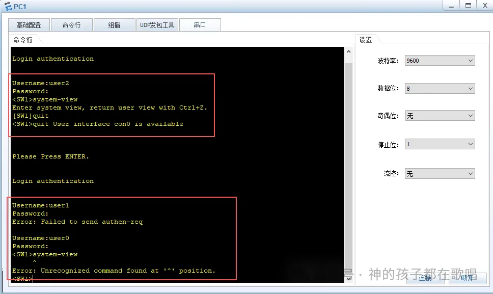 我们从PC端使用不同的用户身份进行本地登录测试。可以发现,user2用户成功登录后可以进入系统视图,而权限等级较低的user0用户则无法进入,仅能执行部分基础命令。这清晰地展示了AAA模式在权限控制上的作用。