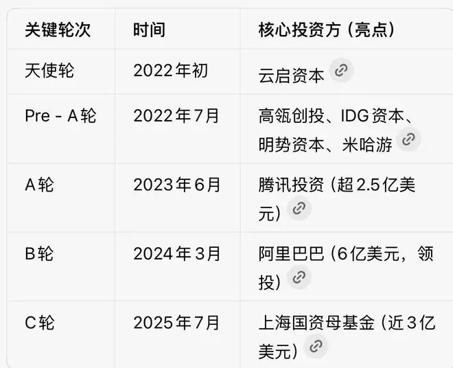 IPO前阿里间接持股13.66%为第一大机构股东,高瓴、米哈游、红杉、腾讯等产业巨头与顶尖VC纷纷入局,2025年上海国资母基金的加入更添"国家队"背书,C轮融资后估值突破40亿美元,与智谱并肩第一梯队。