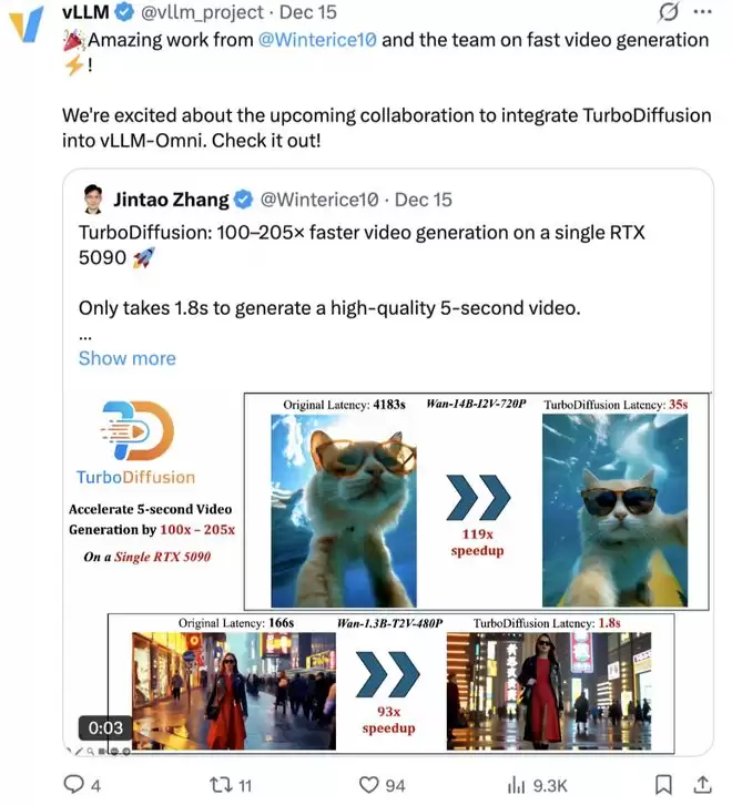 更惊人的是,在Vidu模型上使用TurboDiffusion中包含的技术,也可以在不损失视频生成质量的前提下获得极高的推理加速效果。