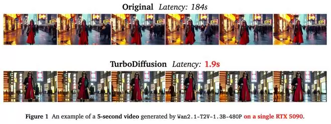 TurboDiffusion生成的视频内容在视觉上无明显差异,但却只需1.9秒。