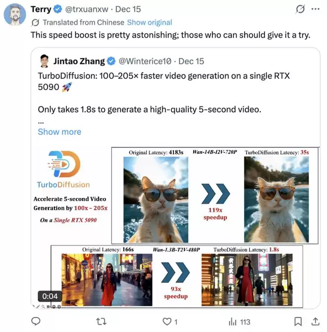 【新智元导读】视频生成领域的「DeepSeek时刻」来了!清华开源TurboDiffusion,将AI视频生成从「分钟级」硬生生拉进「秒级」实时时代,单卡200倍加速让普通显卡也能跑出大片!