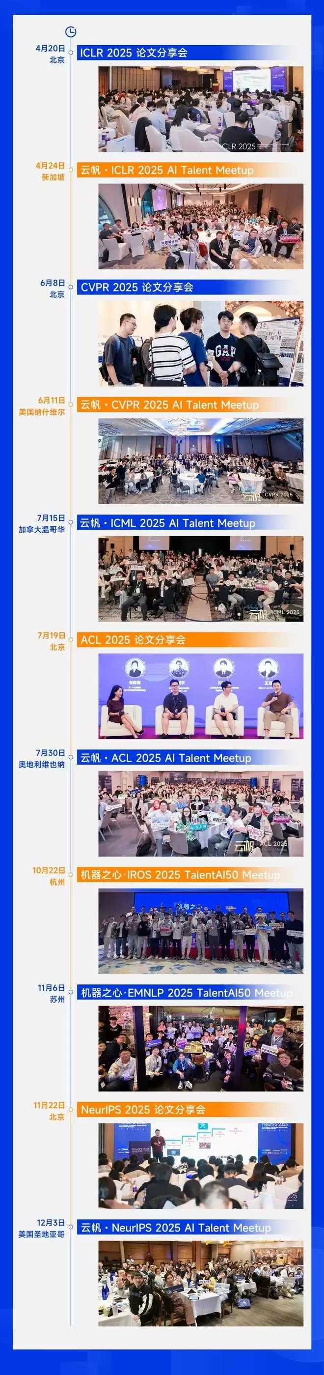 深度研讨,追踪前沿:我们在北京举办的ICLR、CVPR、ACL、NeurIPS论文分享会上,邀请了超过100位论文作者亲临现场,分享最新研究成果,并就多模态、智能体、视频生成、大模型推理等最受关注的话题进行了深入解读与探讨,让前沿成果变得触手可及。轻松连接,激发共鸣:在新加坡、维也纳、温哥华、纳什维尔、圣地亚哥等地举办的“云帆”系列AI Talent Meetup,以及在杭州、苏州发起的“TalentAI50”闭门酒会,则营造了更自由、更聚焦的交流场景。这里没有繁冗的流程,只有志同道合的同行者、灵感迸发的对话以及真诚的合作契机。我们见证了无数老友重逢、新友初识,也亲历了许多合作意向悄然萌发。