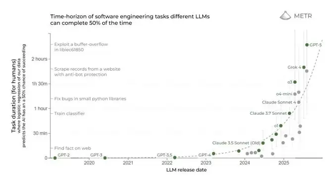 因此,指标METR,从GPT-3到GPT-5,在五年间持续保持了指数级增长,显示出智能体能力增加的速度没有放缓。