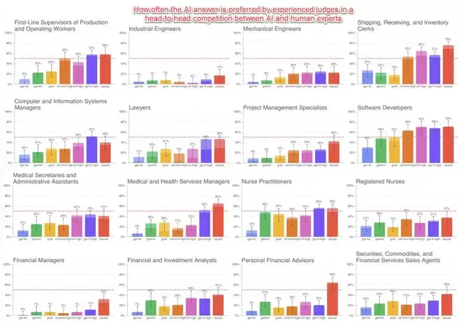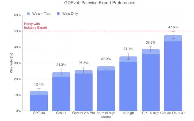 图1:GDPVAL中,不同模型在对应任务上和人类具有相同或更好水平的比例。