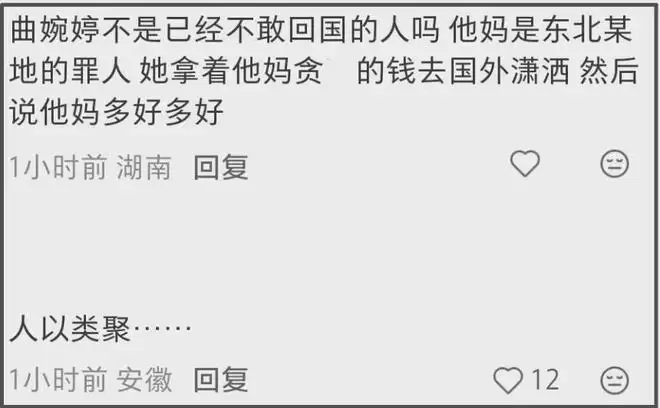 曲婉婷是罪人之女,她的母亲害了数不清的东北人民,让许多家庭在零下三十度的冬天,连取暖的费用都拿不出来,曲婉婷从未表现出愧疚,多次公开为罪犯叫屈,本人更是跑到加拿大,时至今日还能出新歌。