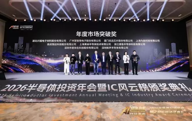 作为中国半导体投资联盟打造的年度行业高端盛会,“2026半导体投资年会暨IC风云榜颁奖典礼”已成为展示我国半导体产业发展的重要舞台。“年度市场突破奖”旨在表彰本年度实现单款产品高销售收入或销量收入突出性高增长,在细分领域市场占有率处于领先地位,产品应用市场广泛的企业,兴福电子以扎实的技术实力与亮眼的市场成绩脱颖而出。