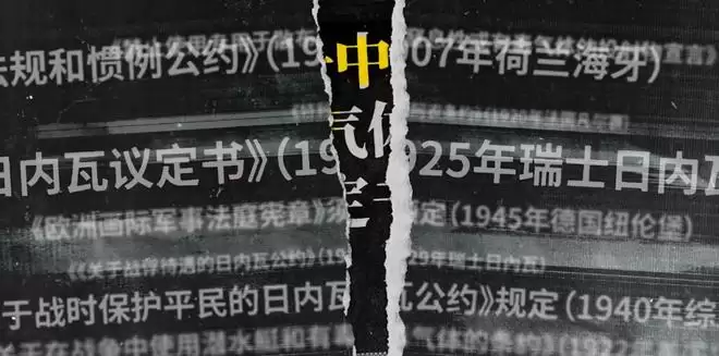 首先“日本细菌战体系”的大红标题后,罗列出的是——《陆战法规和惯例公约》、《日内瓦议定书》、《关于战士保护平民的日内瓦公约》、《禁止使用专用于散布窒息性或有毒气体的投射物宣言》、《欧洲国际军事法庭宪章》、《关于战俘待遇的日内瓦公约》、《关于在战争中使用潜水艇和有毒气体的条约》等国际公约。