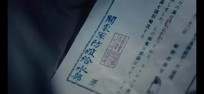 这时他低头看向通知单,镜头随着他的视线下移,给到特写——关东军防疫给水部。