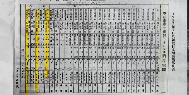 而在1937年7月后新设日本细菌战部队表,石井四郎的基霸名字被重点标记。