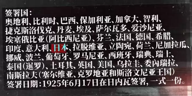 1925年6月17日,签署的37个国家中,日本被重点单独标记出来。