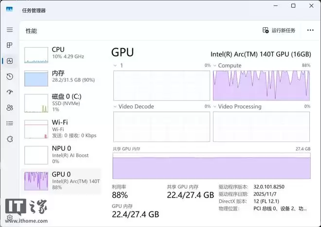 测试过程中,任务管理器数据显示,锐炫 140T 的 Compute(计算)引擎以及内存均处于满负载工作状态,表明硬件性能得到了充分释放。
