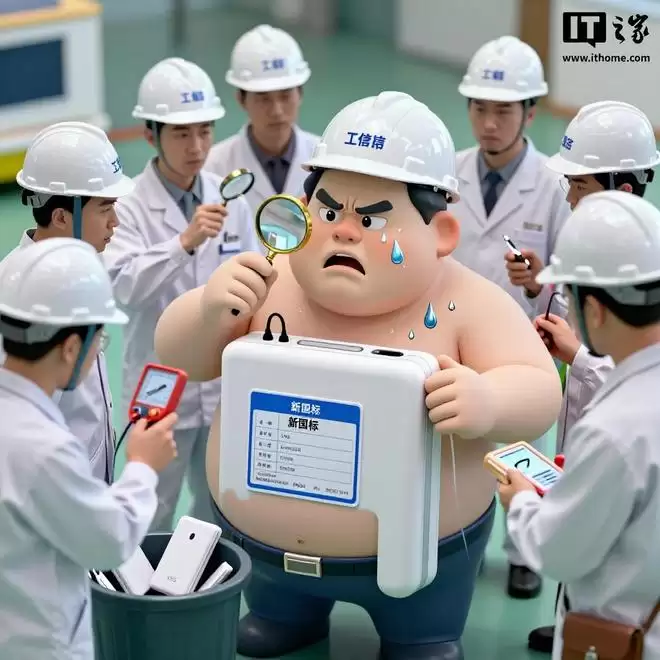 一个胖乎乎的巨大移动电源正在被多个戴着 " 工信部 " 安全帽的工程师进行严格体检,工程师们拿着放大镜、电压表等工具在各个部位检测,表情严肃。移动电源身上贴着 " 新国标 " 的合格证标签,但表情痛苦,浑身冒着汗珠,旁边还有几个不合格的小移动电源被扔进垃圾桶。