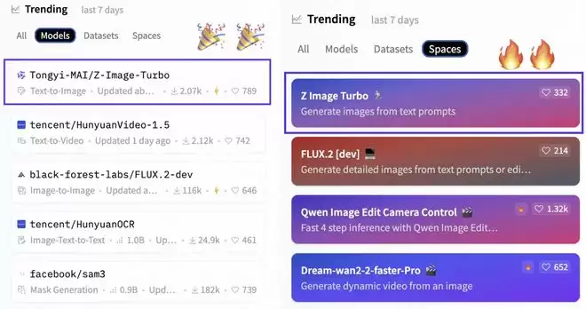 例如,就在近期阿里巴巴通义实验室推出的开源图像生成模型 Z-Image,凭借“轻量且高性能”的特性迅速重塑了竞争格局。数据显示,该模型上线后迅速登顶 Hugging Face 趋势榜双榜第一,发布首日下载量即突破 50 万。