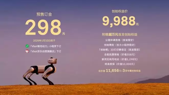 即日起,用户在“Vbot维他动力”最新小程序及“Vbot京东自营旗舰店”上便可参与预订。维他动力表示该产品将于2026年1月启动公测,3月起进入批量交付阶段。据悉,这款机器狗上线52分钟订单便超过了1000台,火热程度超出预期。