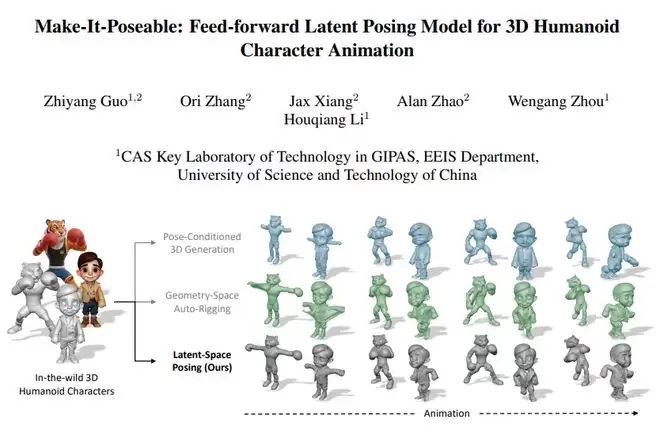 这项突破性的研究由中国科学技术大学GIPAS技术重点实验室的郭智洋、张昊然、项靖旭、赵阿伦等研究人员完成,并于2025年12月18日在计算机视觉领域顶级会议发表,论文编号为arXiv:2512.16767v1。这项名为"Make-It-Poseable"的创新技术,首次实现了让任意3D人形角色在不到一秒钟内完成复杂姿势变换的壮举。