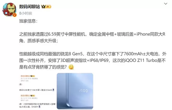 根据博主的爆料,iQOO Z11 Turbo采用6.59英寸中尺寸屏幕,机身设计上更是用上了金属中框与玻璃后盖的组合,辅以类似iPhone的大R角设计。