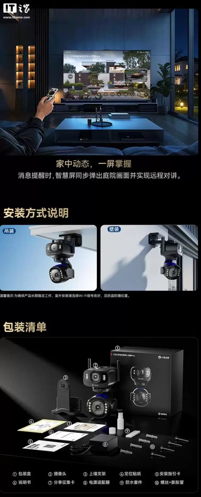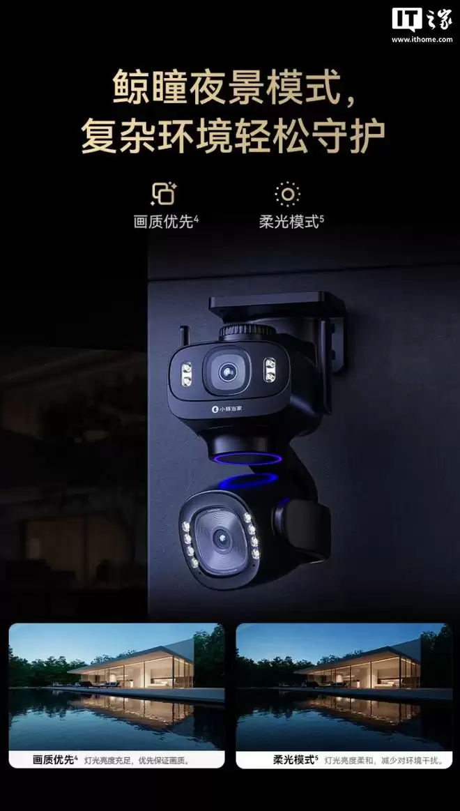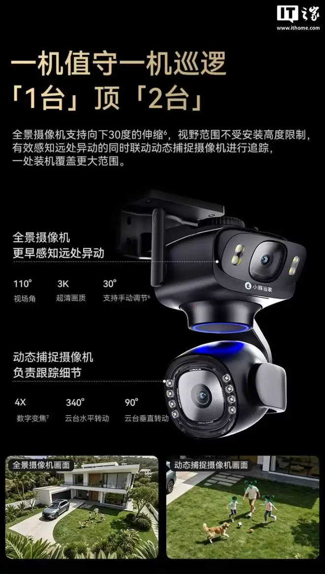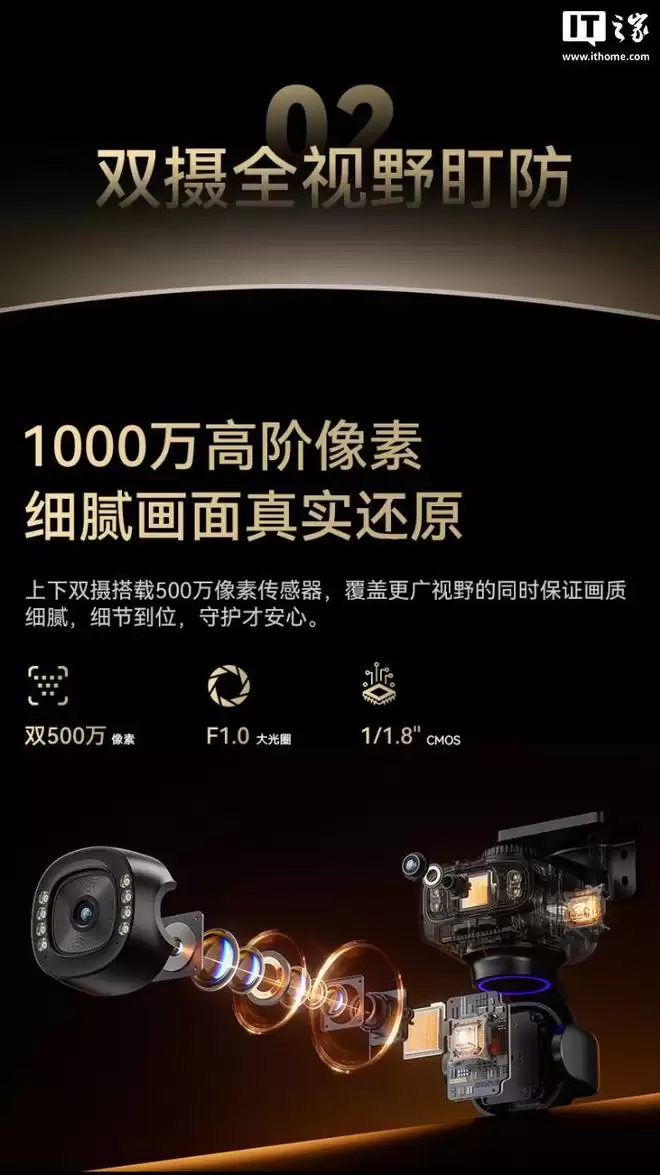 参数方面,这款监控摄像头采用双摄设计,均配备 500 万像素 1/1.8 英寸 CMOS 传感器,拥有 f/1.0 大光圈,顶部的全景摄像机支持向下 30° 伸缩,视场角可达 110°;底部的动态捕捉摄像机则配备云台,可以 340° 水平转动、90° 垂直转动,支持 4X 数字变焦。