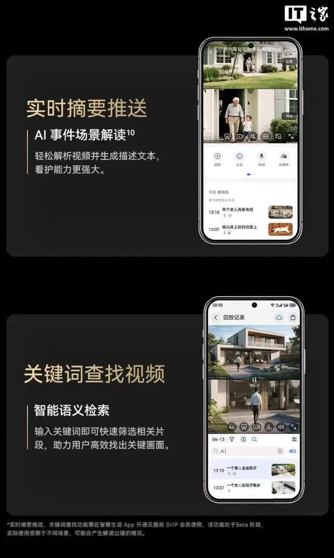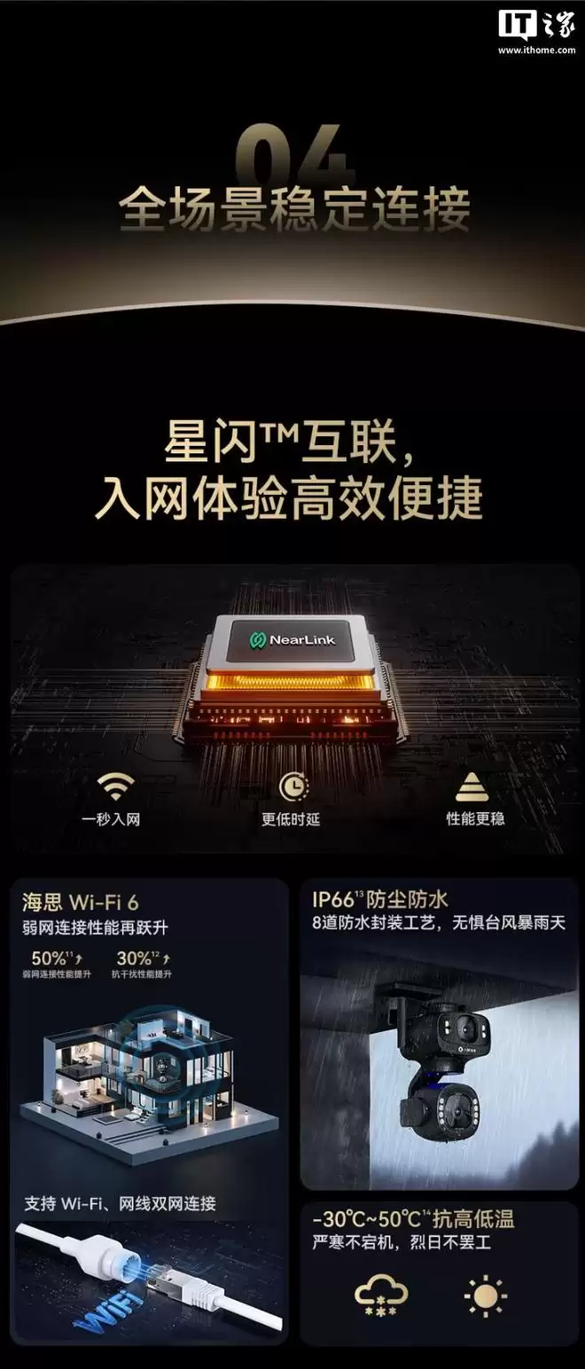 此外,这款摄像头还可以接入智慧生活 App,可用电子围栏功能,支持多机联动追踪轨迹,还可感知庭院活动、火焰、车库等,支持星闪互联,拥有海思 Wi-Fi 6 芯片,支持 IP66 防尘防水,支持 Wi-Fi、网线连接。