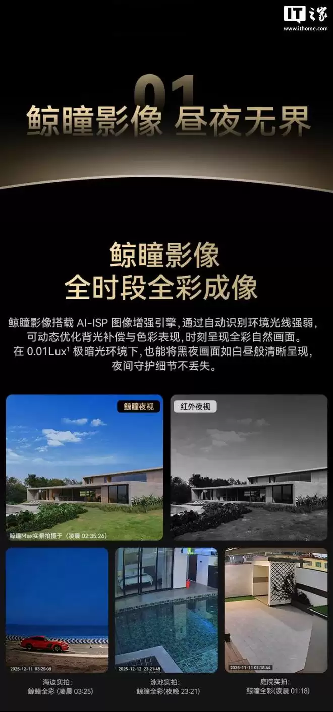 据介绍,这款摄像头配备鲸瞳影像系统,拥有 AI-ISP 图像增强引擎,可动态优化背光补偿与色彩表现,呈现全彩自然画面,号称能在 0.01Lux 的环境下,将黑夜画面“如白昼般呈现”,拥有超清夜市能力,可在 10 米范围内清晰识别车牌号码、车辆特征。