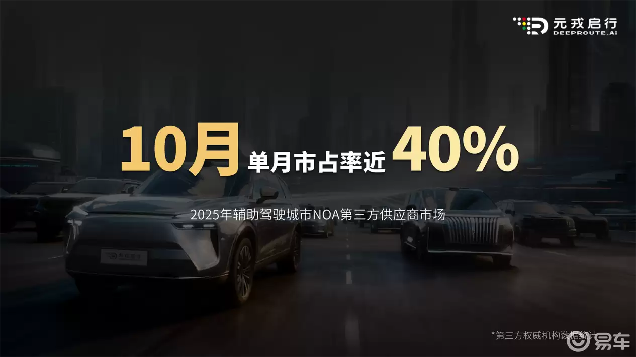 支撑VLA模型量产的,是元启原生成熟的工程化体系。数据显示,该公司已向市场交付20万辆搭载城市NOA(领航辅助驾驶)的量产车型,合作范围覆盖SUV、MPV、越野车等主流品类。根据2025年10月权威机构统计,其在辅助驾驶城市NOA第三方供应商市场的单月市占率已接近40%,稳居行业前列。