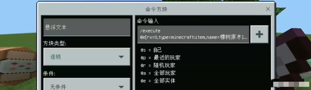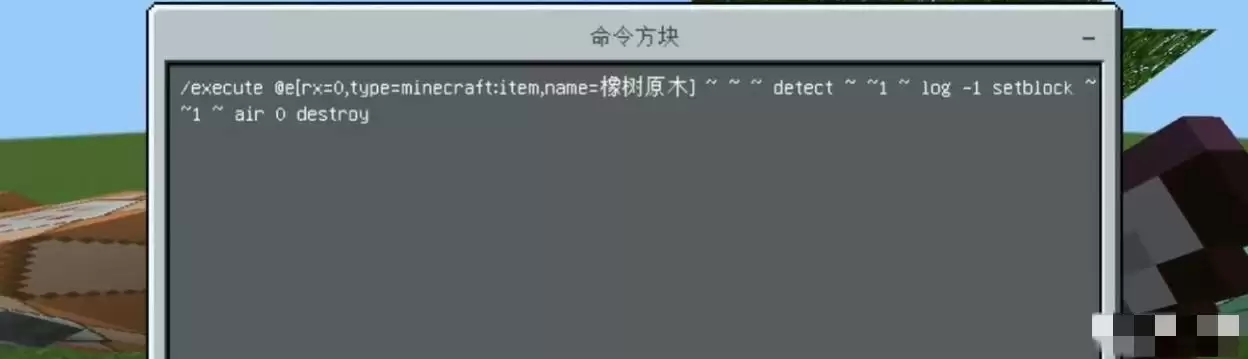 这条指令的作用是:当检测到名为“橡树原木”的物品实体时,会自动探测其上方一格是否为原木方块,并将其替换为空气,从而实现一键清除整棵树的效果。