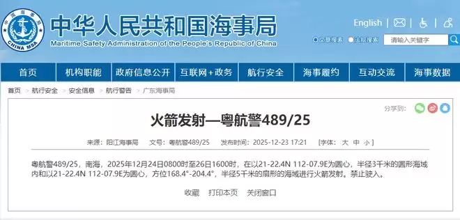 中国海事局于23日发布消息称,阳江海事局已发布航行警告。从12月24日8时至26日16时,在以北纬21-22.4度、东经112-07.9度为中心、半径3000米的圆形海域内,以及以北纬21-22.4度、东经112-07.9度为中心、方位角168.4度至204.4度、半径5000米的扇形海域内,将进行火箭发射作业。相关水域禁止驶入。