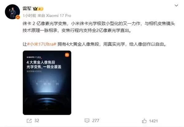 雷军揭秘小米17 Ultra:2亿像素引领影像新浪潮