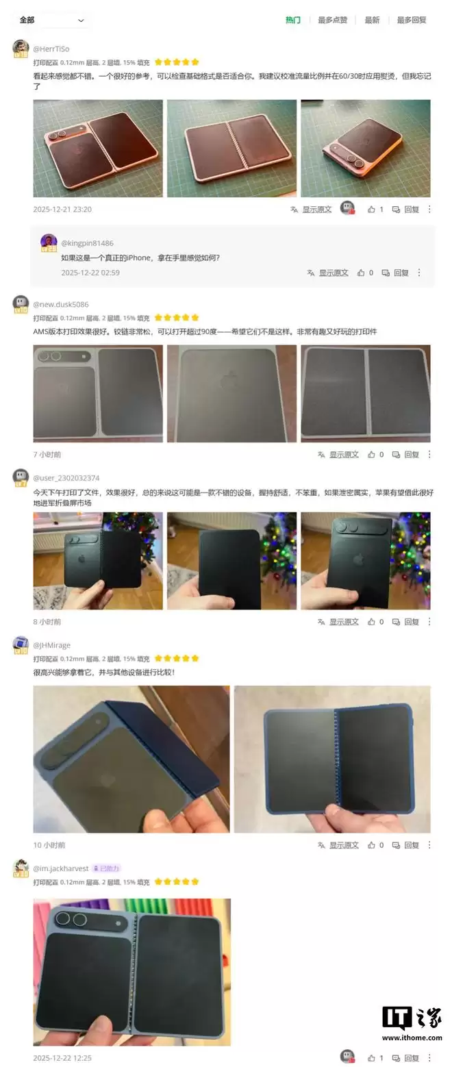 IT之家12月24日消息,科技媒体MacWorld昨日(12月23日)发布文章称,MakerWorld用户Subsy于12月21日分享了一款“iPhone Fold”(暂定名)1:1塑料模型。该模型支持3D打印,让我们得以提前窥见苹果首款折叠屏iPhone的可能样貌。