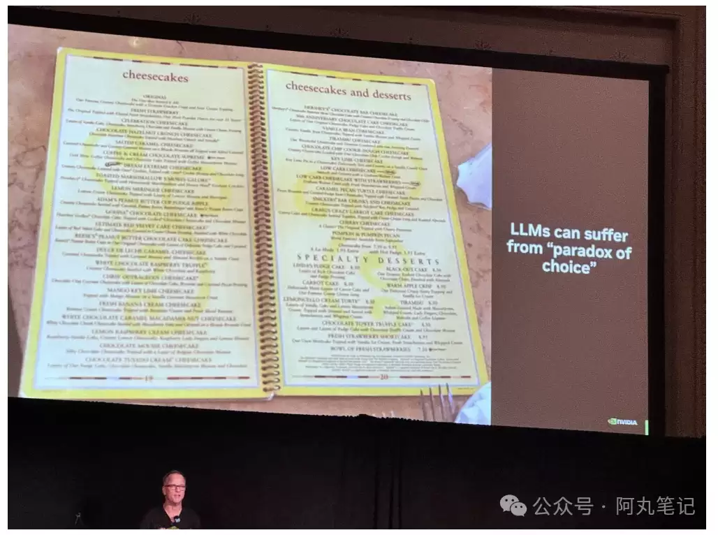 埃里克森展示了一张包含大量芝士蛋挞菜单的幻灯片,用以说明工具选择本身就是一个可靠性问题。