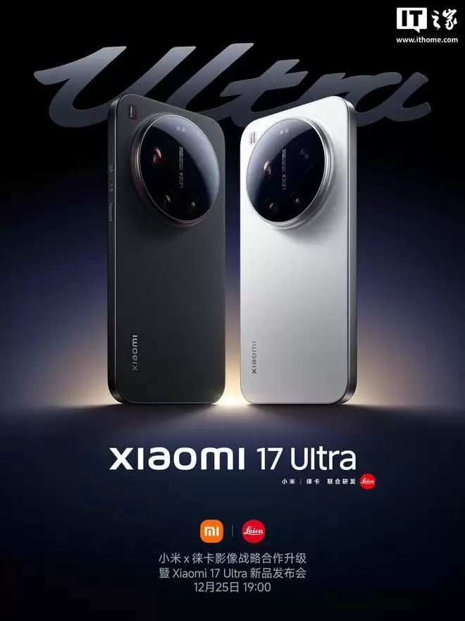 小米与可乐影像战略合作升级暨Xiaomi 17 Ultra新品发布会定档12月25日19:00。作为对比,标准版的小米17 Ultra机身仅印有“LEICA”字样。